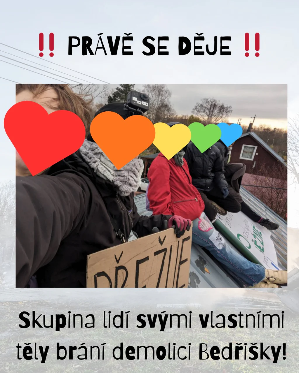 - Příznivci osady Bedřiška protestují proti demolici domů, vylezli na jeden z nich